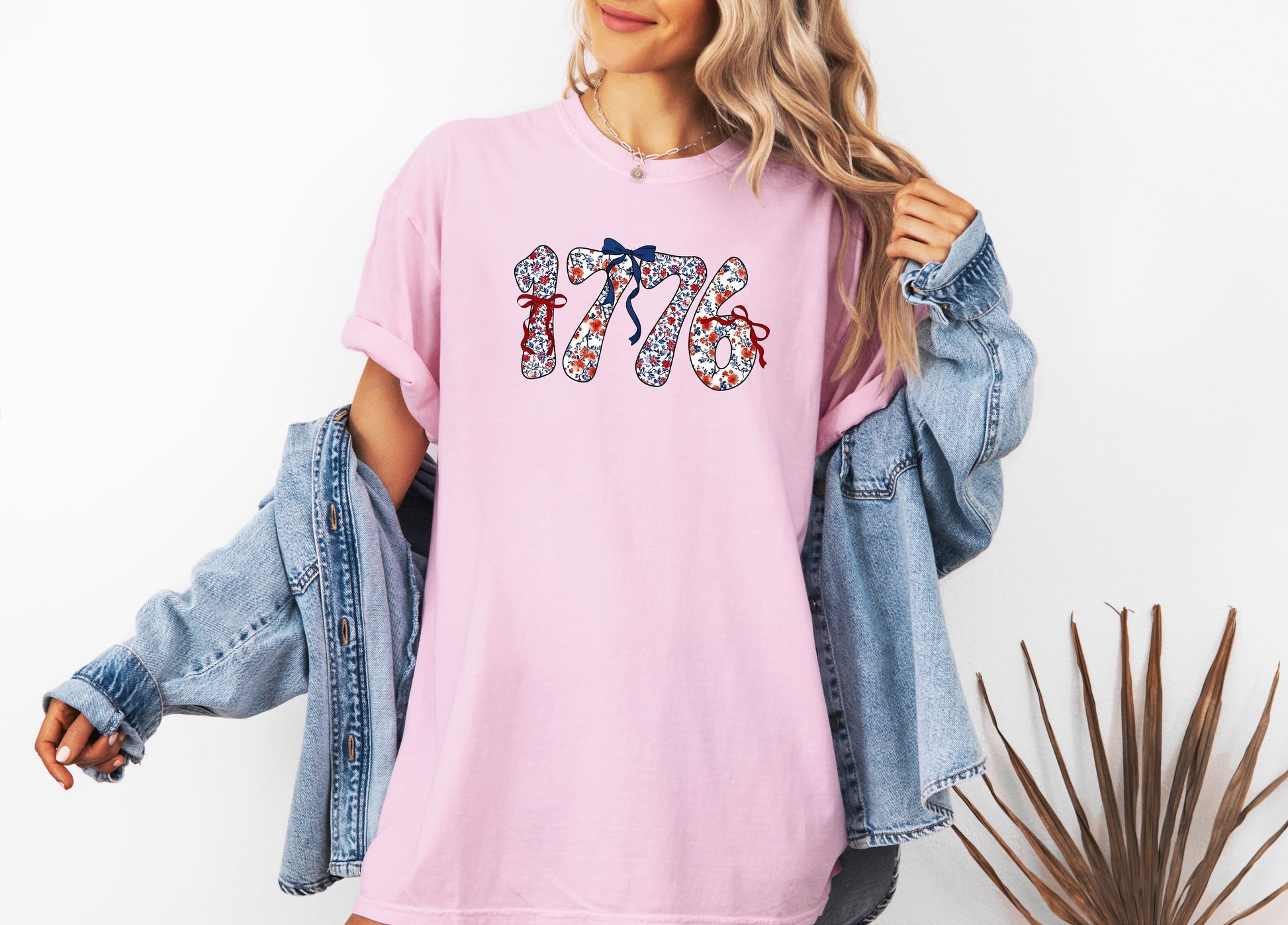 Celebrate Independence Day with a little extra flair in the "Coquette 1776" tee! Featuring the year 1776 in a playful bubble font, filled with a red, white, and blue floral pattern and finished with adorable coquette-style bows, this tee brings a fun, feminine twist to your Fourth of July fit.