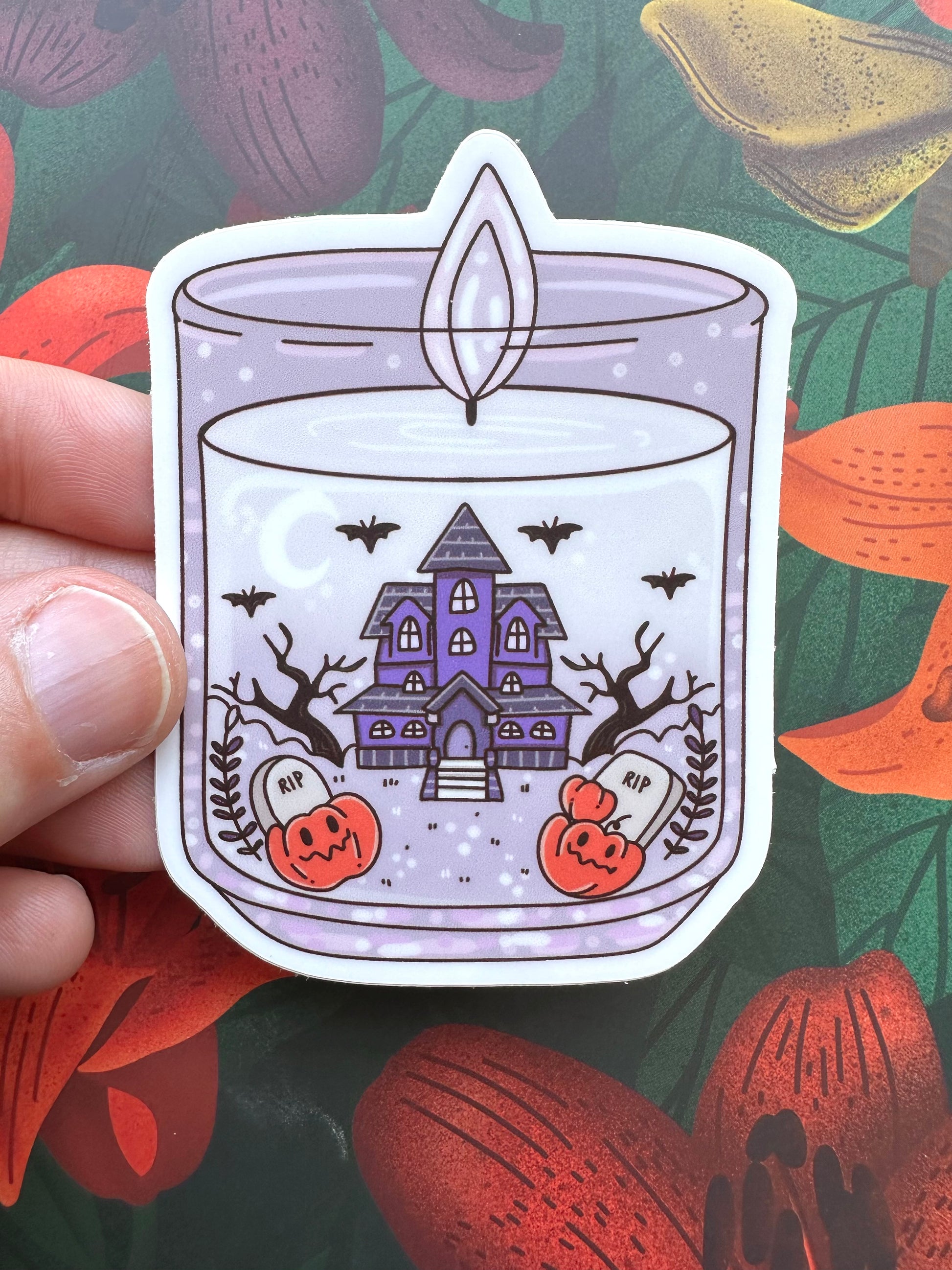 Can you smell that? It’s the scent of crisp leaves, candy corn, and spooky season creeping in. The Smells Like Halloween vinyl sticker features a candle jar filled with haunted charm—a spooky purple house, flying bats, jack-o’-lanterns, bare trees, and tombstones all aglow in a magical little scene.