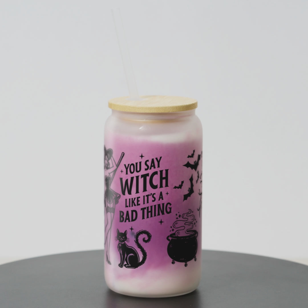 Make every sip spellbinding with the You Say Witch Glass Cup—your new favorite cup for cozy, magical moments!